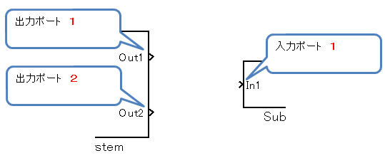 信号線を追加するとは、「出力ポート」から「入力ポート」へ結線を行うことです。ここで、出力ポート、入力ポートとはブロックの出入り口のことです。