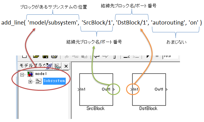 get_paramだと、ブロックを指定するのに ‘model/subsystem/SrcBlock’ などと指定していたのですが、add_lineでは ‘model/subsystem’ と、’SrcBlock/1′ という風に2つの引数に分かれています。