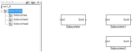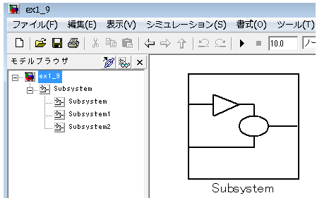モデル ex1_9.mdl を用意し、サブシステムを1つ追加し、名前を「Subsystem」とします。