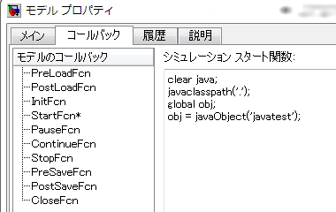 Simulinkモデルの「ファイル」>「プロパティ」>「コールバック」タブにて、次のようにStartFcnの部分をセットします。