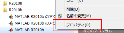 MATLABのショートカットを右クリックして、プロパティをクリックします。